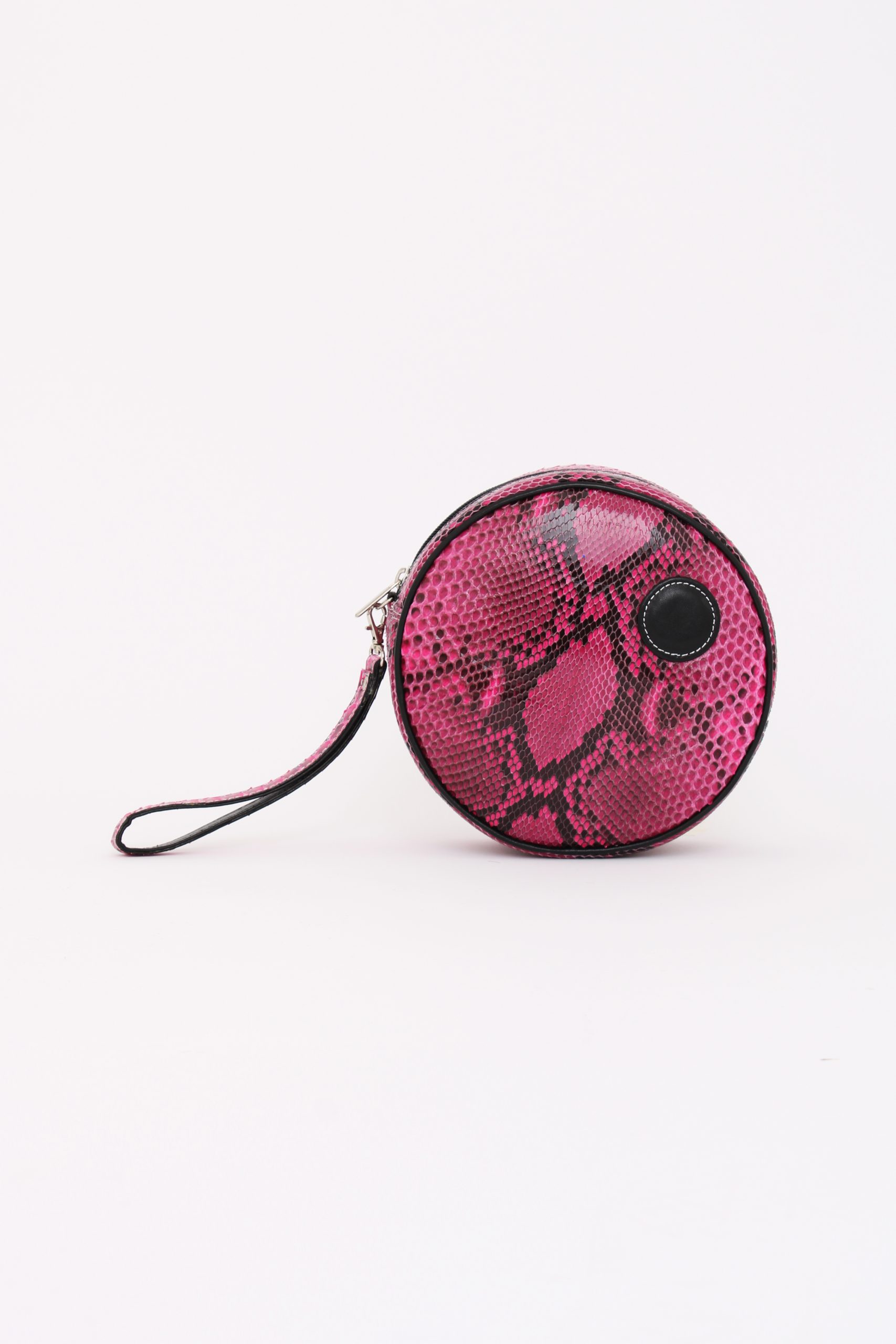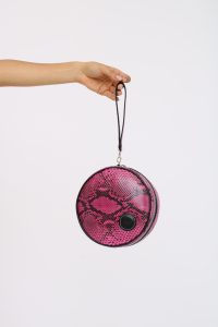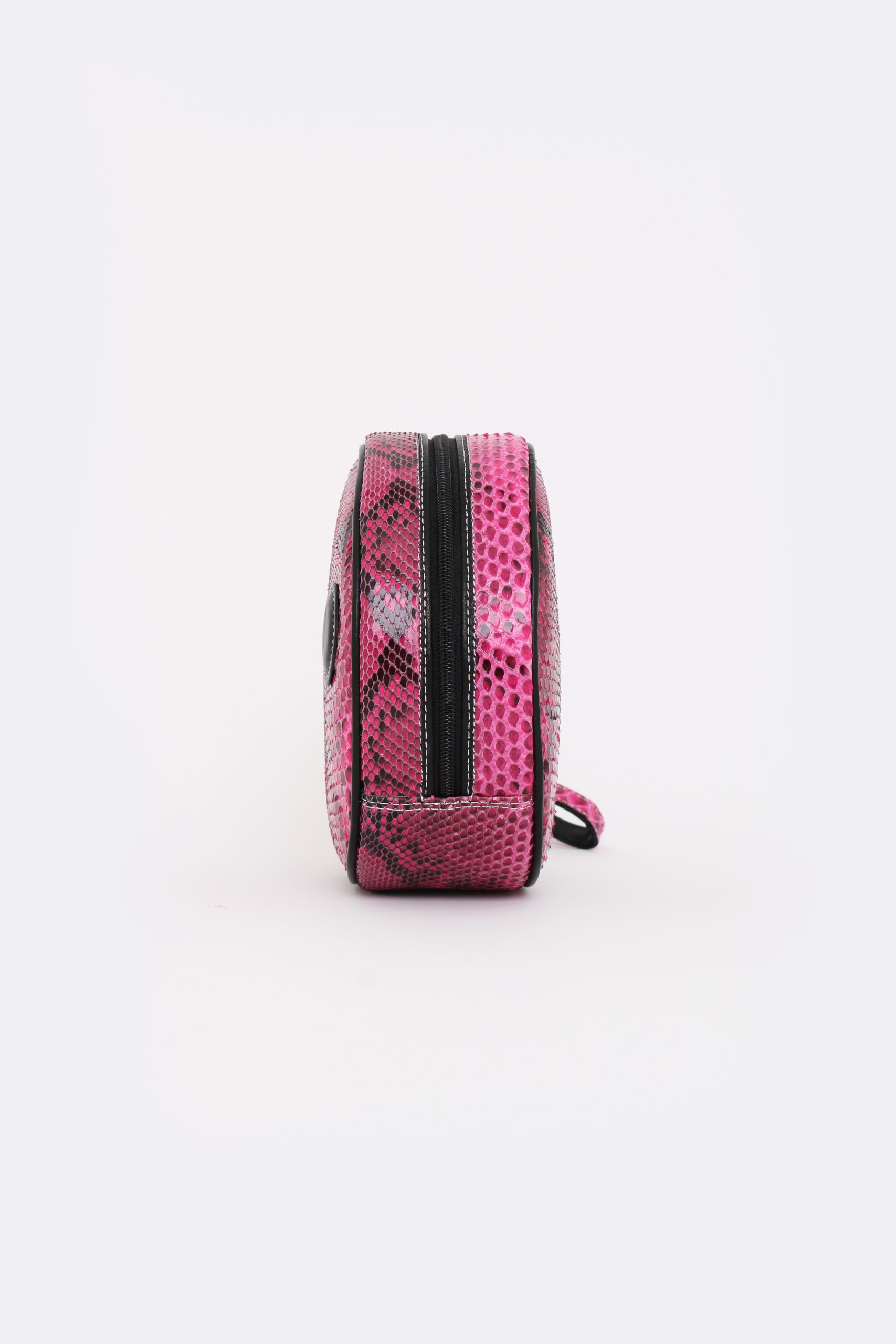 Pelle di pitone di colore fucsia variegato conciata in Italia, Particolare in pelle nappa, Interno in Alcantara Milano, Cuciture filo color nero – Utilizzo cucitrice anni 1960 ( molto importante perché è un processo molto artigianale / punto più largo, Zip e cursore finiture color nero (nichel free)